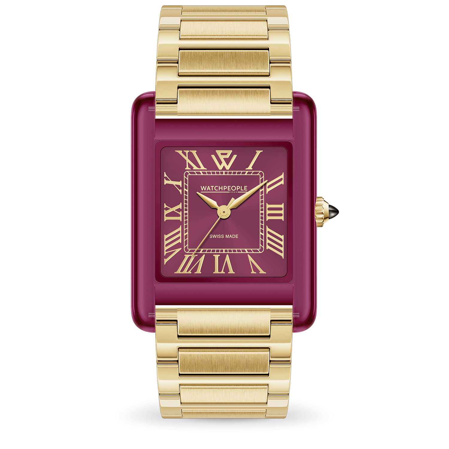 Die WP6 Metal & Clear Mix Gold Deep Burgundy besticht durch ihr tief bordeauxrotes Zifferblatt, das mit einem
