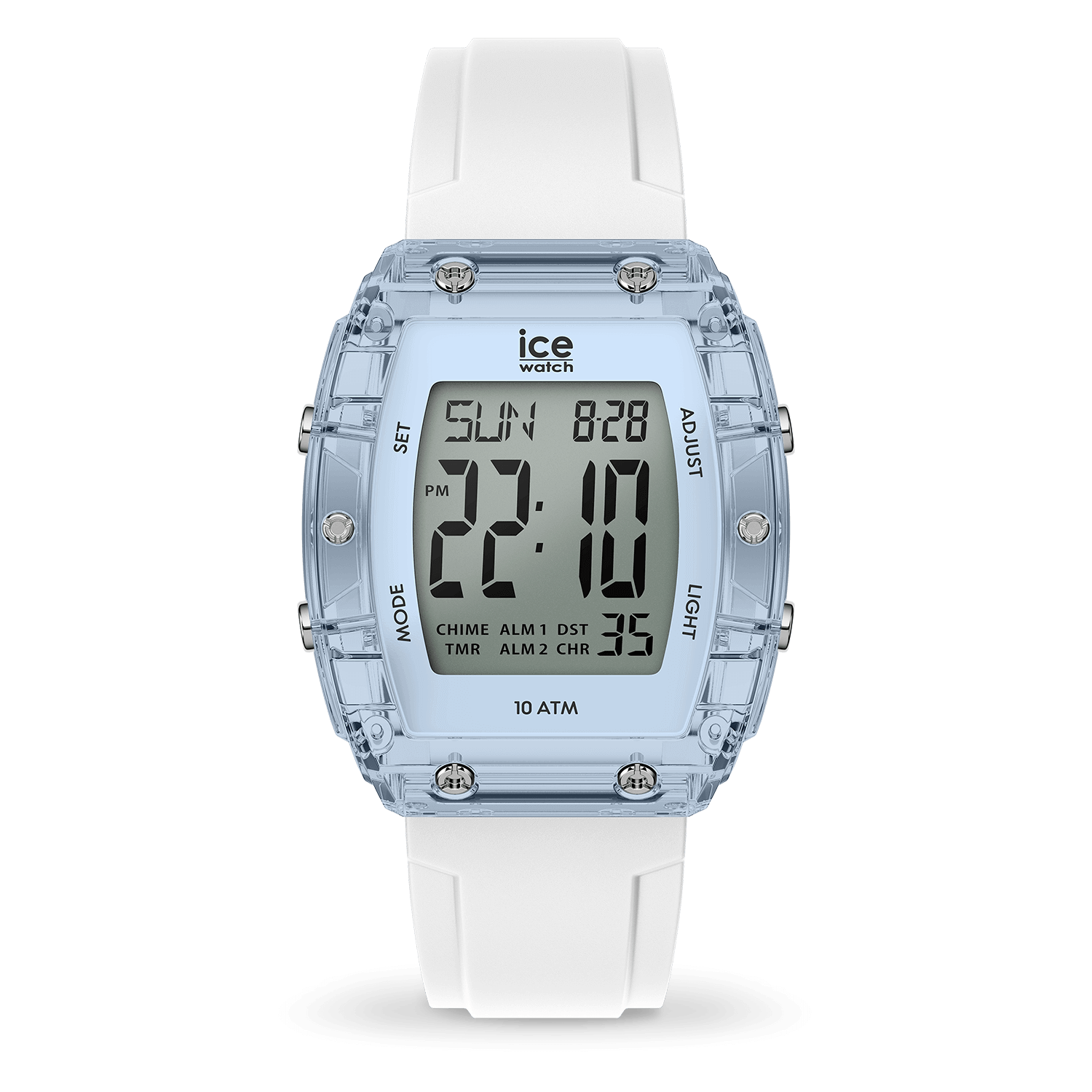 Take a leap into the future with the ICE digit boliday - White Clear blue Silver. Its retro-futuristic design combines a white silicone strap with a transparent blue case for a bold, modern look. The digital display makes it easy to keep track of time and date, and its 10 ATM water resistance makes it perfect for all your aquatic activities. An original model that perfectly blends style and technology for a unique look.