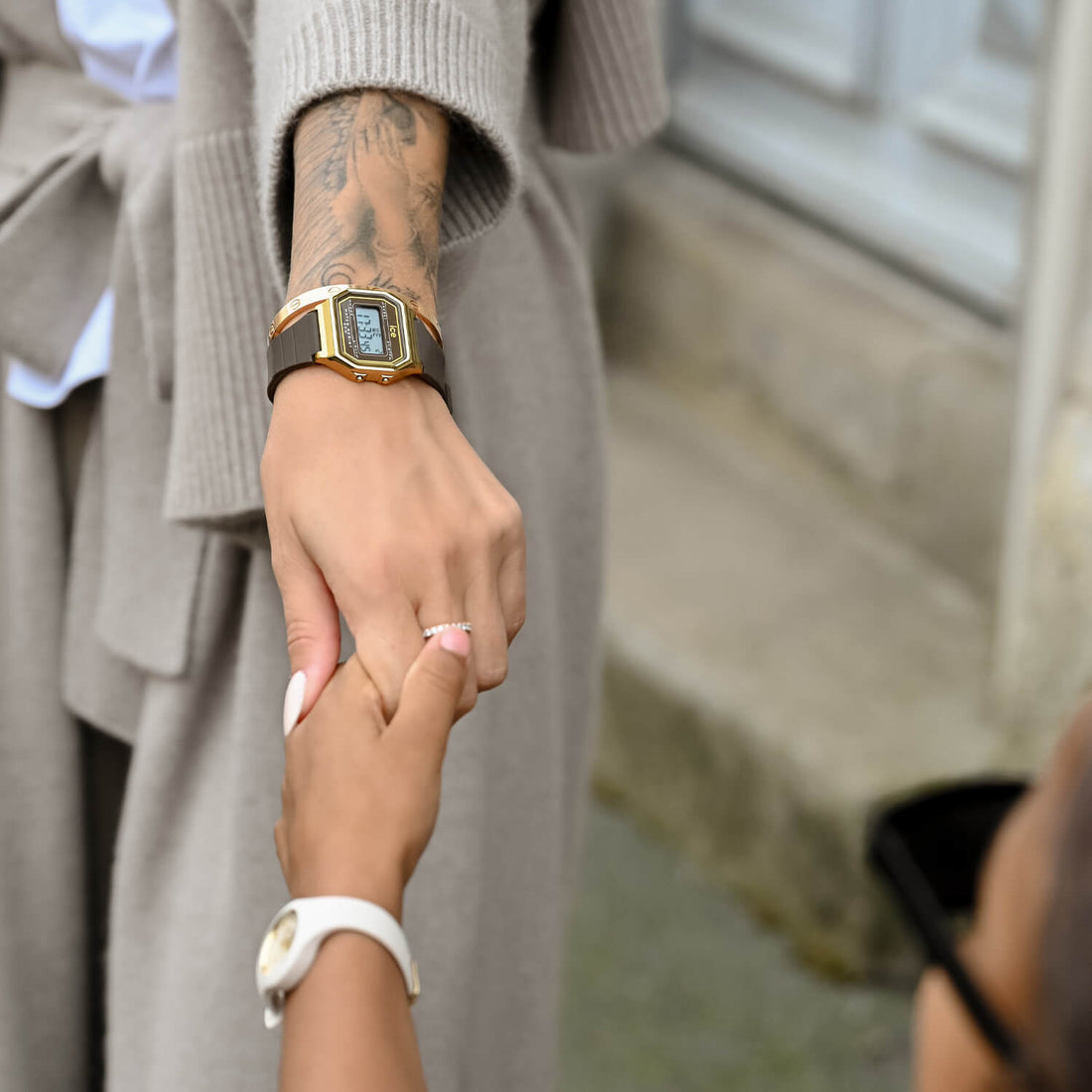 Bezwijk voor de charme van dit ICE digit retro - Babyatoutprix - Brown gold, bedacht en ontworpen in co-creatie met @babyatoutprix! Zachte tinten en mooie vleugjes zilver om je pols het hele jaar door te kleuren. Alle horloges in de collectie, die in beperkte oplage worden geproduceerd, zijn voorzien van het logo van de beroemde contentdesigner op de achterkant van de kast.